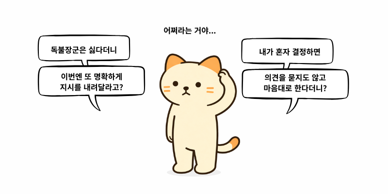 팀원의 의견을 적극 수용하려고 "네 생각은 어때?"라고 물어보면 오히려 팀원은 갈피를 못잡고 방황하는 경우도 많습니다. 이런 팀원들은 오히려 '팀장이 명확하게 지시해주기를' 바랍니다.