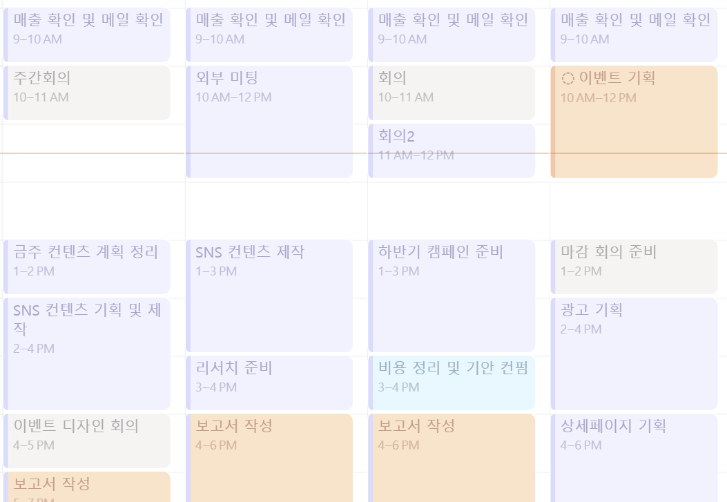 - 중요한 일부터 시간 블록을 먼저 배치하니, 우선 순위기 명확해졌어요.